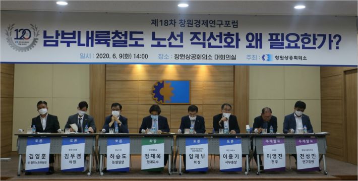 창원상의는 9일 오후 2시 창원상공회의소 대회의실에서 '남부내륙철도 노선 직선화 왜 필요한가?'라는 주제로 제18차 창원경제연구포럼을 개최했다.