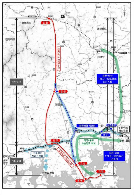 창원시의 남부내륙고속철도 타당성 조사 및 기본계획 수립 용역에 참여하고 있는 ㈜유신의 이영진 전무는 "남부내륙철도 건설에 있어 현재의 안대로라면 기존 경전선과 겹쳐 KTX 운행횟수가 오히려 줄 수 있고, 경남의 중·동부지역과 수도권 간의 시간단축도 미흡해 경남의 균형발전 차원에서 기대효과가 반감될 수 있다"고 진단했다. 그는 "김천-합천-함안-고성-통영-거제를 잇는 이른바 남부내륙철도의 직선화가 좋은 대안이 될 수 있다"고 주장했다. 특히 "직선화가 이루어진다면, 공사비 절감과 운행시간을 단축할 수 있고, 고속철도 수혜인구 증가로 경남 중·동부권으로 확대효과도 기대된다. 일반철도의 여객과 물류수송 수요도 커 철도시설의 효율성과 활용성 향상도 기대할 수 있다"고 설명했다.