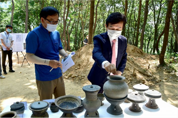 진주시 가좌동 고분군 6기 봉토분서 나온 각종 유물들을 조규일 진주시장이 살펴보고 있다. (사진=진주시 제공)