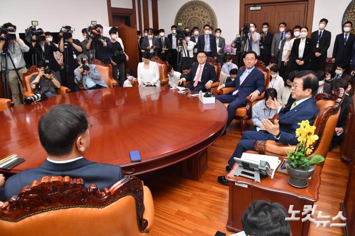 박병석 국회의장이 11일 오전 서울 여의도 국회 의장실에서 열린 원내대표 회동에서 발언하고 있다.