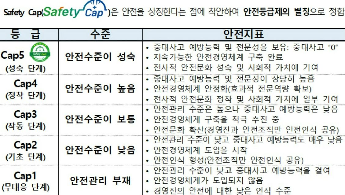 매년 안전역량(안전계획, 안전조직·인력·예산 등), 안전수준(위험요소 관리노력 및 상태 등), 안전가치(사회적 기여, 사고현황 등)를 심사해 5단계의 안전등급을 부여한다.
