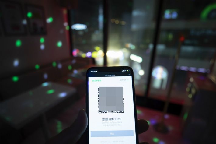 노래연습장과 클럽, 헌팅포차 등 감염병 전파 위험이 큰 고위험시설 출입에 전자출입명부 시스템이 의무화된 10일 오후 서울의 한 노래방에서 취재진이 QR코드를 들어보이고 있다. (사진=연합뉴스)