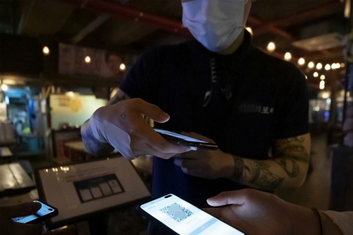 노래연습장과 클럽, 헌팅포차 등 감염병 전파 위험이 큰 고위험시설 출입에 전자출입명부 시스템이 의무화된 10일 오후 서울의 한 술집을 찾은 시민이 네이버 앱 QR코드를 이용하고 있다. (사진=연합뉴스)