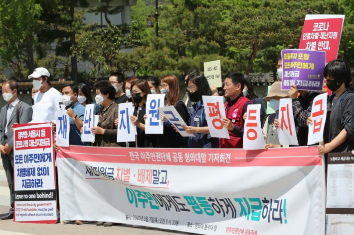 지난달 7일 이주공동행동 등 이주민 인권단체 회원들이 청와대 분수대 광장에서 신종 코로나바이러스 감염증(코로나19) 사태에 따른 긴급재난지원금을 이주민에게도 평등하게 지급할 것을 촉구하는 기자회견을 하고 있다. (사진=연합뉴스/자료사진)