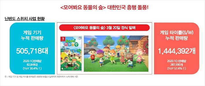 특히 인기 신작 게임 '모여봐요 동물의 숲'(동숲)이 1분기 끝자락인 3월 20일 발매됐다는 점을 고려하면 2분기 판매량은 더욱 신장했을 가능성이 점쳐진다.
