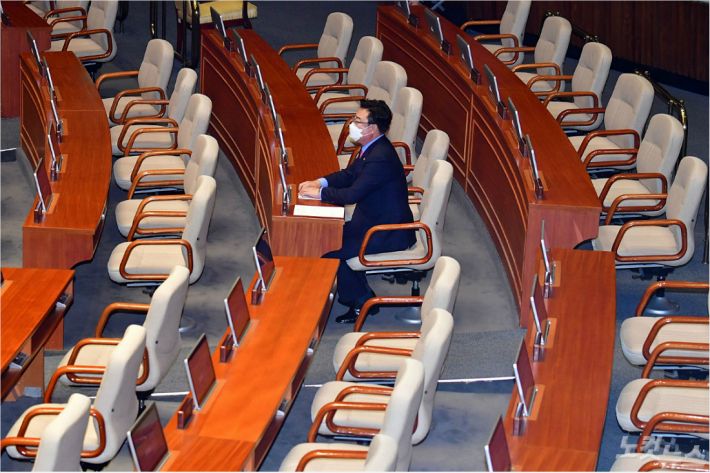 미래통합당 김성원 원내수석부대표가 12일 국회 본회의에 의사진행 발언을 위해 홀로 참석하고 있다. (사진=윤창원 기자)