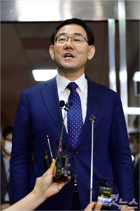 미래통합당 주호영 원내대표가 12일 오전 국회에서 박병석 국회의장을 항의 방문하고 나서며 발언을 하고 있다. (사진=윤창원 기자)