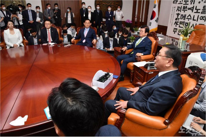 김태년 더불어민주당 원내대표가 11일 오전 서울 여의도 국회 의장실에서 원구성 협상을 위해 마련된 원내대표 회동에 참석해 발언하고 있다. (사진=윤창원 기자)