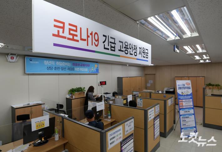 15일 오전 서울 중구 서울고용복지플러스센터를 찾은 시민들이 코로나19 긴급고용안정지원금 안내를 받고 있다. 코로나19사태로 소득이 급감한 특수고용직 종사자 등 고용보험 사각지대 노동자를 대상으로 1인당 150만원을 지급하는 '긴급 고용안정지원금' 신청을 이날부터 요일에 상관없이 할 수 있게 됐다.