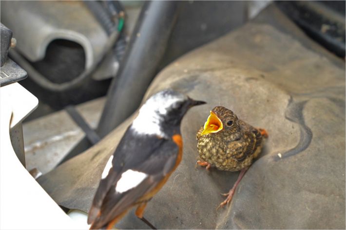 경주엑스포 직원 업무용 전기차 엔진룸에 앉아 있는 아빠새와 새끼 딱새(사진=경주엑스포 제공)