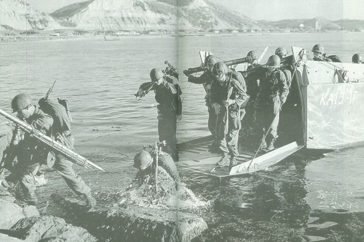 1950년 7월 현 학산방파제(포항여객선터미널)에서 이뤄진 미군의 포항상륙작전. (사진=포항6.25 제공)