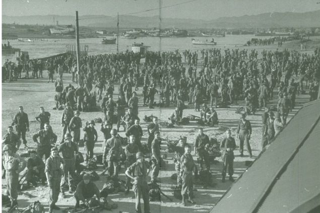 1950년 7월 22일 미군의 제2차상륙부대원들이 이동명령을 위해 송도에서 집결하고 있는 모습. 멀리 동빈내항이 보인다. (사진=포항6.25 제공)
