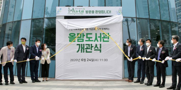 24일 오전 부산 남구 대연혁신지구에서 열린 '올맘도서관 개관식'에서 지역 8개 공공기관 관계자들이 제막식을 진행하고 있다. (사진=캠코 제공)