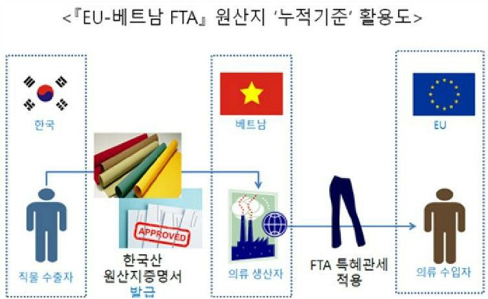 8월 1일부터 발효되는 EV FTA에는 한국산 직물(fabrics)을 사용해 베트남에서 생산한 의류제품을 EU로 수출할 때 한국산 직물을 베트남산으로 보고 FTA 특혜관세 혜택을 부여하는 원산지 누적기준이 담겼다.