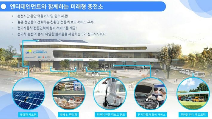 '친환경 복합 전기충전 플랫폼'은 기존 전기차 충전소와 차별화되는 복합시설로, 태양광발전시설·ESS(에너지저장시설)·연료전지 등 친환경 발전설비를 통해 전기자동차와 퍼스널모빌리티(PM) 등 다양한 기기의 전력공급원으로 활용되고, PM공유, 차량정비, 세차·주차장 등의 부대서비스를 비롯해 카페·편의점, ICT체험공간 같은 편의시설을 하나의 공간에서 이용할 수 있는 다목적 플랫폼을 말한다.
