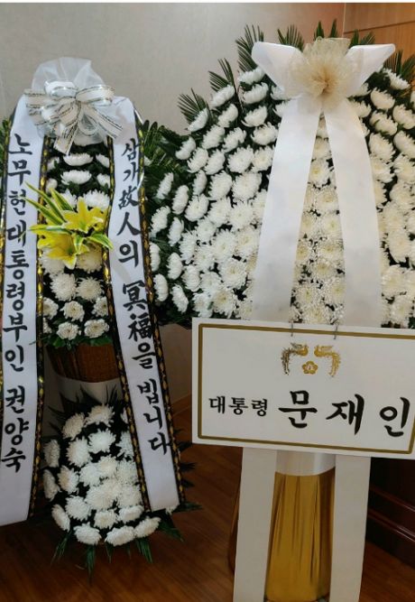 조화와 조기도 빼곡했다. 문재인 대통령을 비롯해 노무현 전 대통령의 부인 권양숙 여사, 민주당 이해찬 대표가 보낸 조화도 놓였다.
