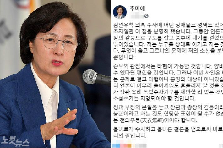 그러면서 "누구를 상대로 이기고 지는 것에 저를 걸지 않는다. 무엇이 옳고 그르냐의 문제에 저의 소신을 분명히 하고 책임을 다할 뿐"이라며 "법무부가 장관 몰래 독립수사기구를 제안할 리는 없다. 언론과 대검의 소설쓰기는 지양돼야 한다"고 선을 그었다.