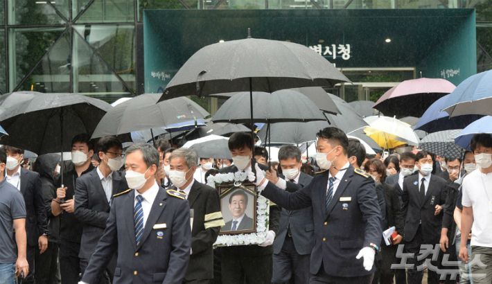 13일 오전 서울시청에서 열린 고 박원순시장 영결식을 마친 영정이 서울 시청을 떠나고 있다. (사진=이한형 기자)