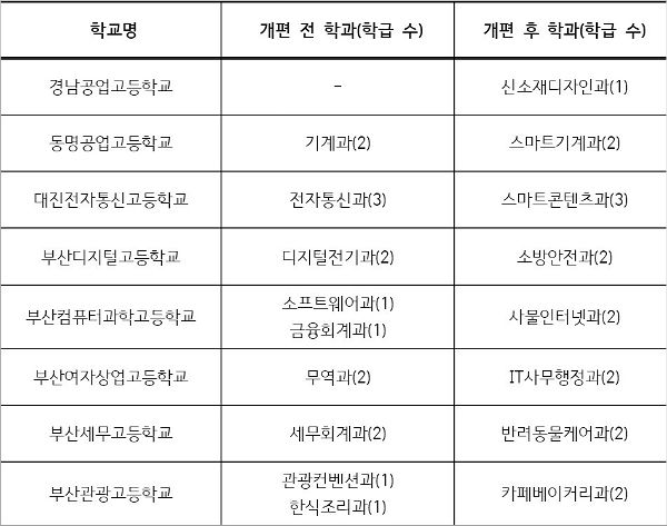 또, 부산여상 무역과를 IT사무행정과로, 부산세무고 세무회계과를 반려동물케어과로, 부산관광고 관광컨벤션과와 한식조리과를 카페베이커리과로 각각 개편한다. 경남공고에는 신소재디자인과를 신설한다.