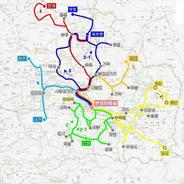 동부지역의 시내버스 운행방식은 기존 시내지역에서 동부지역 각 마을로 다니던 일반버스가 반성터미널을 기점으로 동부지역만을 운행하는 순환버스와 시내지역에서 반성터미널을 경유해 반성수목원까지 운행하는 일반버스로 나눠지게 된다.