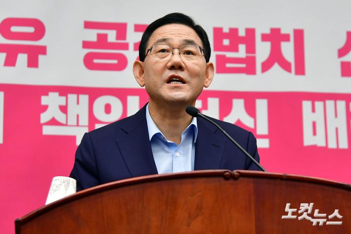 미래통합당 주호영 원내대표가 15일 오전 국회에서 열린 당 의원총회에서 발언을 하고 있다.