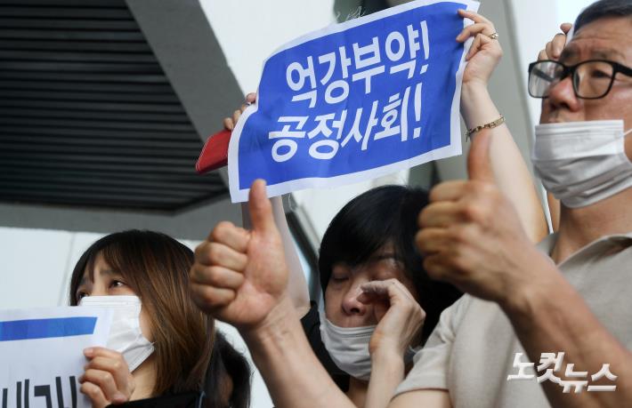 16일 오후 경기도 수원시 경기도청 앞에서 이재명 경기도지사 지지자들이 응원 문구를 들고 눈물을 흘리고 있다. 이 지사는 대법원의 허위사실 공표 혐의에 대한 무죄취지 파기환송 판결로 지사직을 유지하게 됐다.
