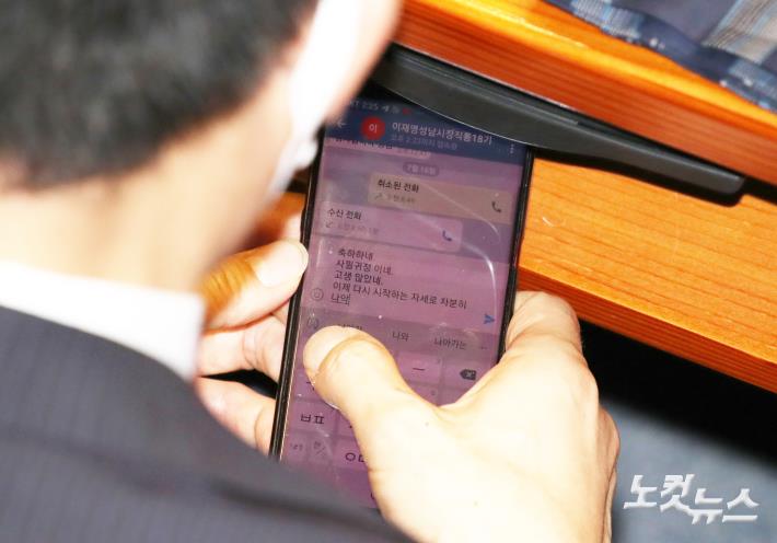 16일 국회에서 열린 제21대 국회 개원식에서 민주당 의원이 대법원에서 무죄취지의 파기환송 선고를 받은 이재명 지사에게 메시지를 보내고 있다.
