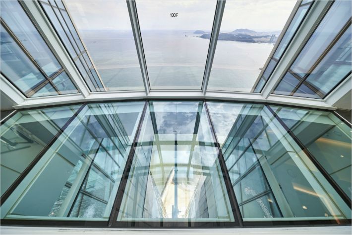 부산 최고층 건물 엘시티 랜드마크타워 꼭대기층에 해운대 앞 바다와 시가지 전경을 조망할 수 있는 전망대가 17일 문을 열어 새로운 부산 관광명소가 될 전망이다.