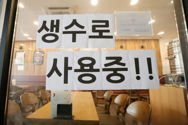 16일 오후 인천시 서구 한 음식점에 '수돗물 유충' 사태로 인한 생수 사용을 알리는 안내 문구가 부착돼 있다.(사진=연합뉴스)