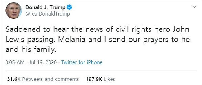 문제는 트럼프 대통령의 뒤늦은 트윗이다. 그는 버지니아주 스털링의 골프장에서 휴일골프를 친 뒤 오후 트위터 계정에 "민권 영웅 존 루이스의 별세 소식을 듣고 슬픔에 잠겼다. 멜라니아와 나는 그와 그의 가족에게 우리의 기도를 보낸다"고 짤막한 글을 올렸다.