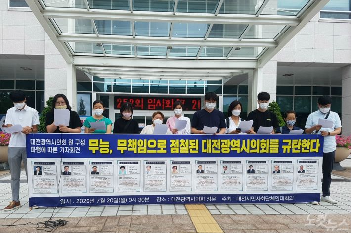 연대회의는 "대전시의 업무보고와 조례 제·개정 심의 등 산적한 현안들이 많고, 무엇보다 코로나19의 극복을 위해 역량을 모아야 할 시기임에도 대전시의회가 발목을 잡고 있다"고 규탄했다.