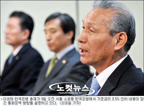 한국은행 금융통화위원회가 기준금리를 2.5%p로 인하한 가운데 이성태 한국은행 총재는 기준금리를 추가 인하할 가능성을 시사했다. 또 지난해 4분기 상당히 큰 폭의 마이너스 성장을 했으며, 올해 경제 성장률 전망치도 하향 조정되고 있다고 밝혔다.