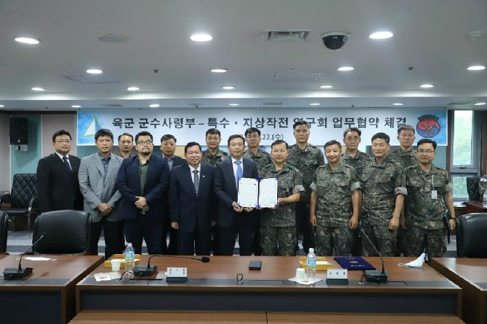 특수·지상작전 연구회(LANDSOC-K)는 육군 군수사령부와 미래 전장환경에 대비한 육군 군수체계 발전을 목표로 업무협약식을 갖고 22일 양해각서를 교환했다고 밝혔다.