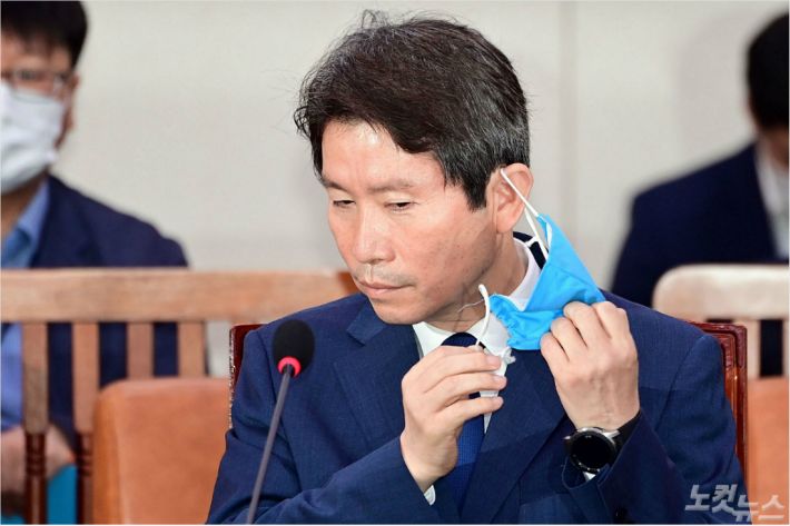 이인영 통일부 장관 후보자가 23일 오전 국회 외교통일위원회 인사청문회에서 마스크를 벗고 있다. (사진=윤창원 기자)