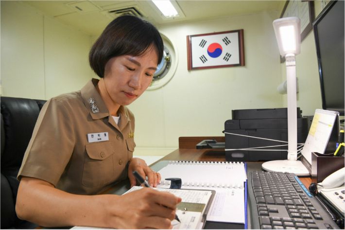 24일 성인봉함 함장으로 취임한 안미영 중령(진급 예정자)이 함장실에서 업무를 보고 있다. (사진=해군 제공)