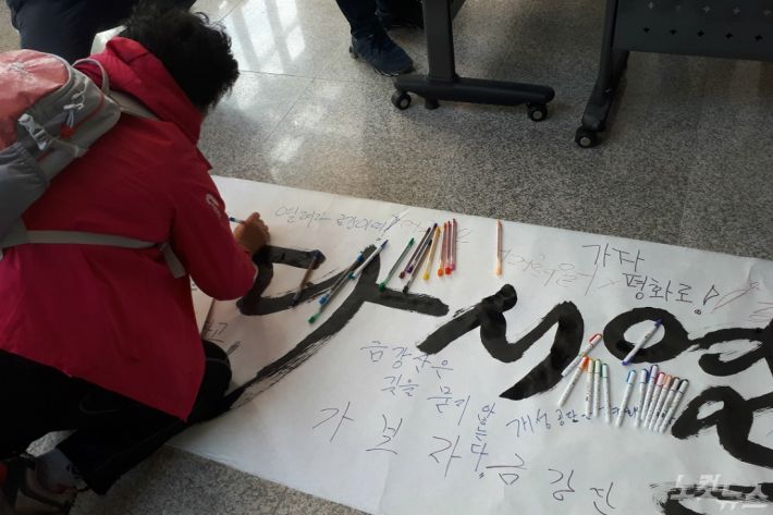 지난해 11월 18일 강원 고성군 DMZ 박물관에서 열린 '개성공단·금강산관광 재개를 위한 각계 대표 평화회의'에 참여한 한 시민이 평화를 염원하는 소망을 현수막에 쓰고 있다.(사진=유선희 기자/자료사진)
