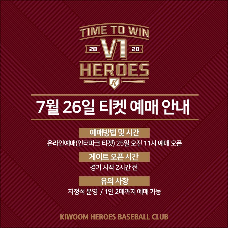 키움은 오는 26일 서울 고척스카이돔에서 열리는 '2020 신한은행 SOL KBO 리그' 롯데 자이언츠와 주말 3연전 마지막 날 경기에서 전체 좌석 1만6731석의 10%인 1674석 티켓을 판매한다.