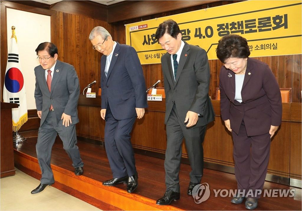 서상목 사회안전망 4.0 대표(왼쪽부터), 미래통합당 김종인 비상대책위원장, 원희룡 제주도지사, 미래통합당 서정숙 의원이 23일 오전 서울 여의도 국회도서관에서 열린 사회안전망 4.0 정책토론회에서 기념촬영을 마친 뒤 단상을 내려오고 있다. (사진=연합뉴스 제공)