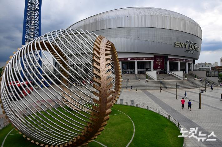 프로야구 관중 입장 첫 날인 26일 서울 고척 스카이돔을 찾은 야구팬들이 입장을 하고 있다. 문체부는 이날 진행되는 프로야구 경기부터 관중석 10%의 규모로 관중을 입장시키기로 했다