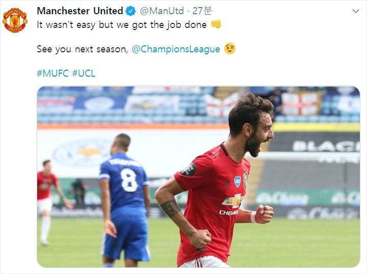맨유는 27일(한국시간) 영국 레스터의 킹파워 스타디움에서 열린 레스터 시티와 2019~2020 잉글랜드 프리미어리그 최종전에서 2대0으로 승리했다.