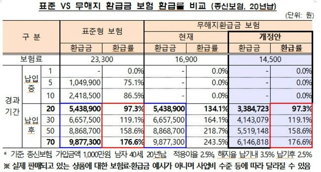 예를 들면 현재 보험료가 1만 6900원인 무해지환급금 보험은 납입 중간에 해지를 하면 환급률이 한 푼도 없다. 하지만 보험료 낸 지 20년이 지나면 환급률이 134.1%로 껑충 뛴다. 2만 3300원인 표준형 보험은 납입 중간에 환급률이 70~80%, 20년 납입 후에는 97.3%다. 이번 개정안에 따르면 무해지환급금보험도 20년 납입 후에도 134%가 아니라 97.3%로 환급률이 제한되는 것이다.