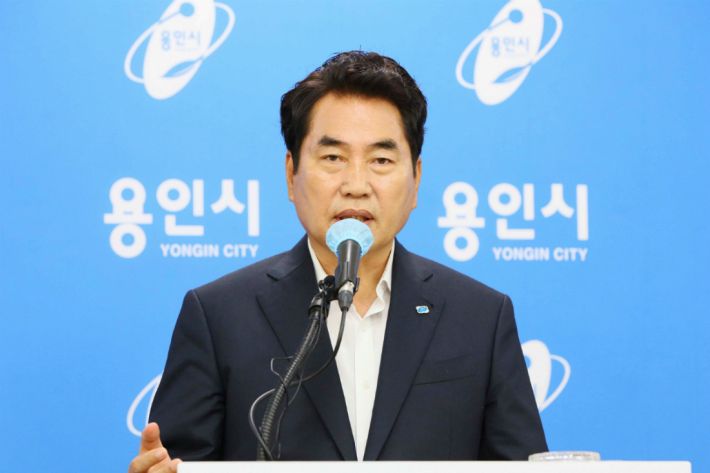 백군기 용인시장이 27일 시청 브리핑룸에서 동천동 물류센터 관련 주민청원에 대한 답변을 하고 있는 모습이다.(사진=용인시청 제공)