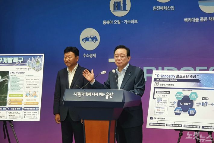 송철호 울산시장과 이선호 울주군수는 27일 시청 프레스센터에서 기자회견을 열고 울주군이 강소연구개발특구로 지정됐다고 밝혔다.(사진=이상록 기자)