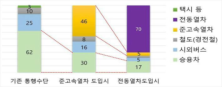 그러나 이 구간에 전동열차와 준고속열차가 도입되면 어떤 교통 수단을 이용할 것인지에 대한 질문에는 응답자의 70%가 전동열차라고 답했다. 그리고 응답자의 17%만 승용차라고 답해 분담률이 45%p나 줄어들었다. 시외버스·준고속열차 각 5%이다.