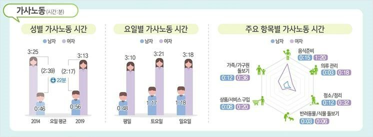 성인 남녀 간 일평균 가사노동시간 차이는 지난해 2시간 17분으로 5년 전보다 22분 줄었다.