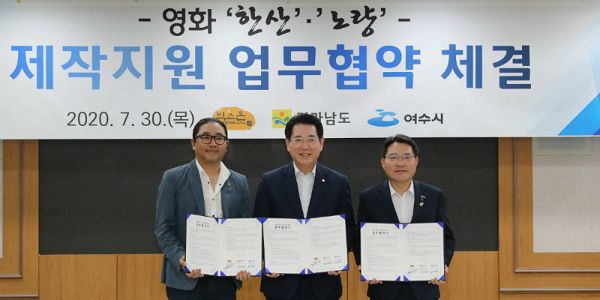 전라남도는 30일 전남도청 정약용실에서 김영록 전남지사와 권오봉 여수시장, 김한민 영화감독 등이 참석한 가운데 한산과 노량 제작지원과 전라남도 홍보를 위한 업무협약을 맺었다.