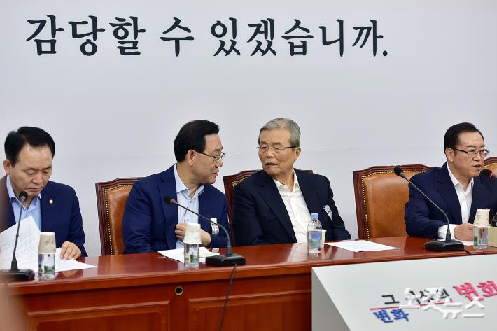 미래통합당 김종인 비대위원장과 주호영 원내대표가 3일 오전 국회에서 열린 비상대책위원회의에서 대화를 하고 있다.