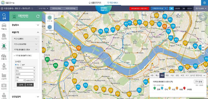 생활안전지도 홈페이지에서 치안안전 분야로 들어가 위험도를 볼 수 있으며, 서울‧ 인천‧경기 지역 23개 노선 730개 역에 대해 조회가 가능하다.