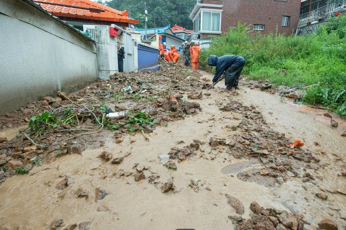 이런 가운데 복구작업도 사흘째 진행 중이다. 군에 따르면 이날까지 공무원 300여 명, 소방 20여 명, 군인 80여 명, 경찰 10여 명 등 모두 500여 명이 복구작업에 동원돼 구슬땀을 흘렸다. 또 굴삭기 30여 대, 덤프트럭 10여 대도 투입됐다.