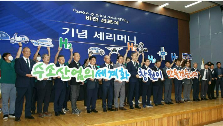 창원시는 지난달 28일 '2040 수소정책 비전 선포식'을 개최하고, 수소산업의 중심지 창원을 알리는 퍼포먼스를 하고 있다.(사진=창원시 제공)